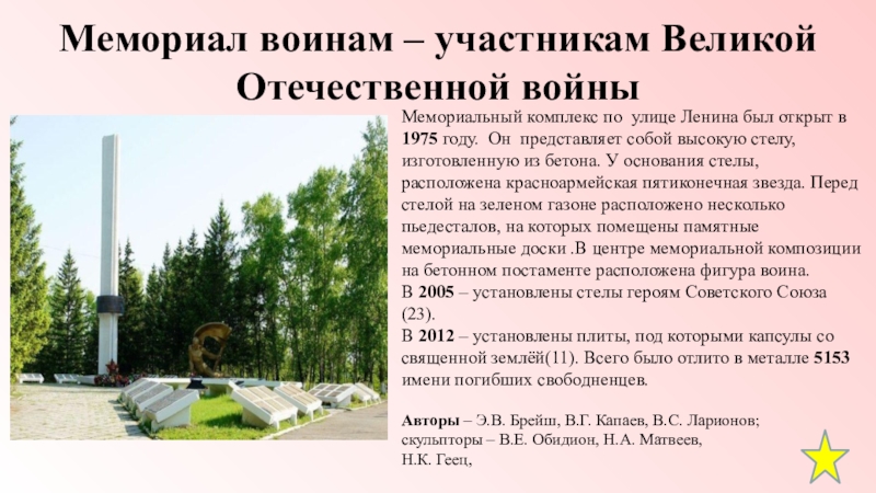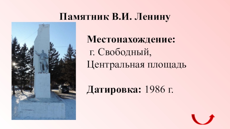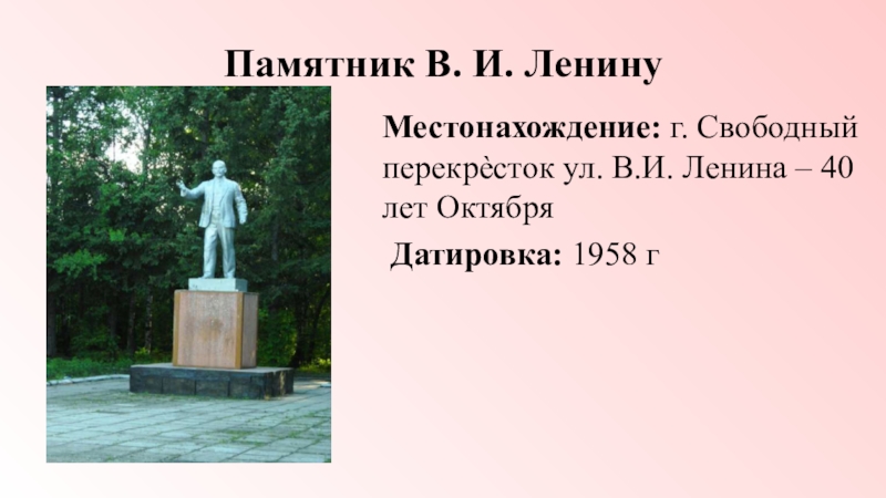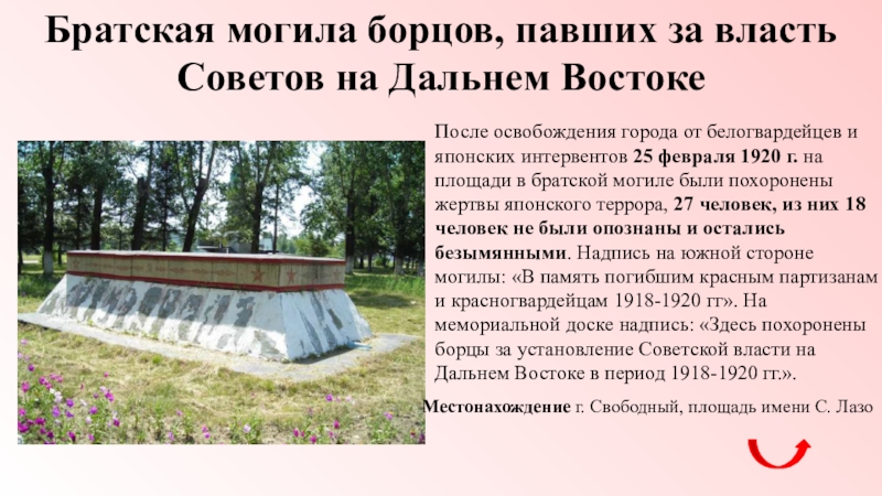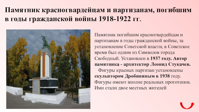Слайд 18Памятник красногвардейцам и партизанам, погибшим в годы гражданской войны 1918-1922 гг.