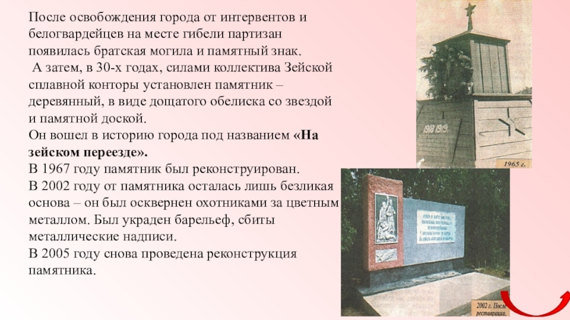 А затем, в 30-х годах, силами коллектива Зейской сплавной конторы установлен памятник – деревянный, в виде дощатого обелиска со звездой и памятной доской.