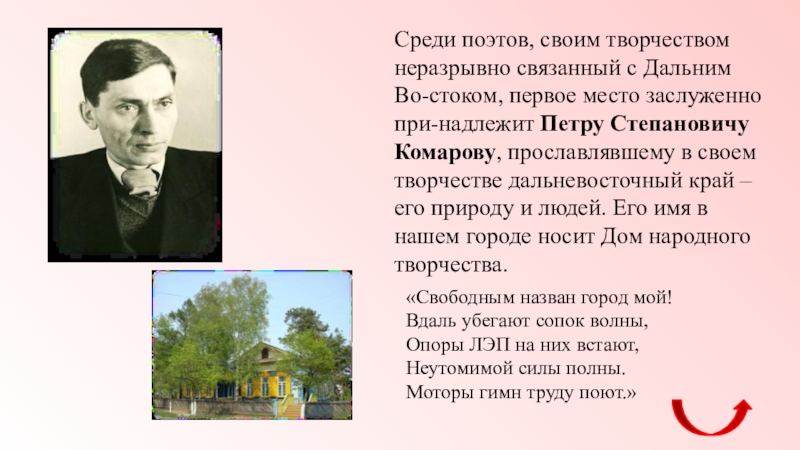 заслуженно при-надлежит Петру Степановичу Комарову, прославлявшему в своем творчестве дальневосточный край – его природу и людей. Его имя в нашем городе носит Дом народного творчества.