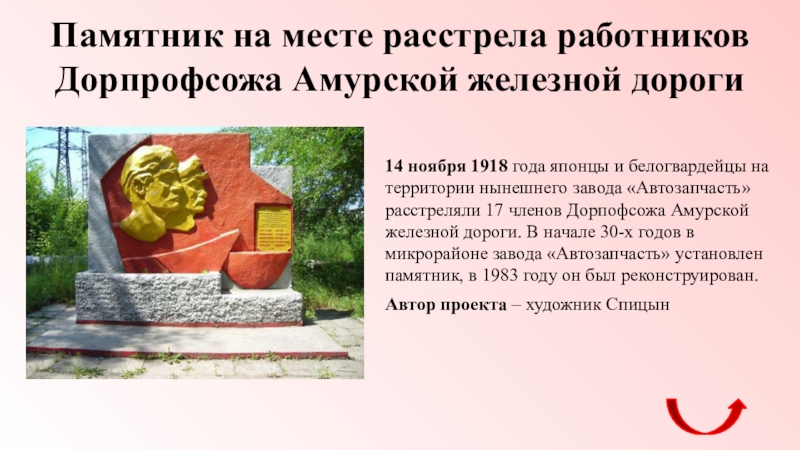 японцы и белогвардейцы на территории нынешнего завода «Автозапчасть» расстреляли 17 членов Дорпофсожа Амурской железной дороги. В начале 30-х годов в микрорайоне завода «Автозапчасть» установлен памятник, в 1983 году он был реконструирован.