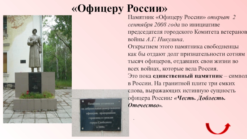 Памятник «Офицеру России» открыт 2 сентября 2008 года по инициативе
