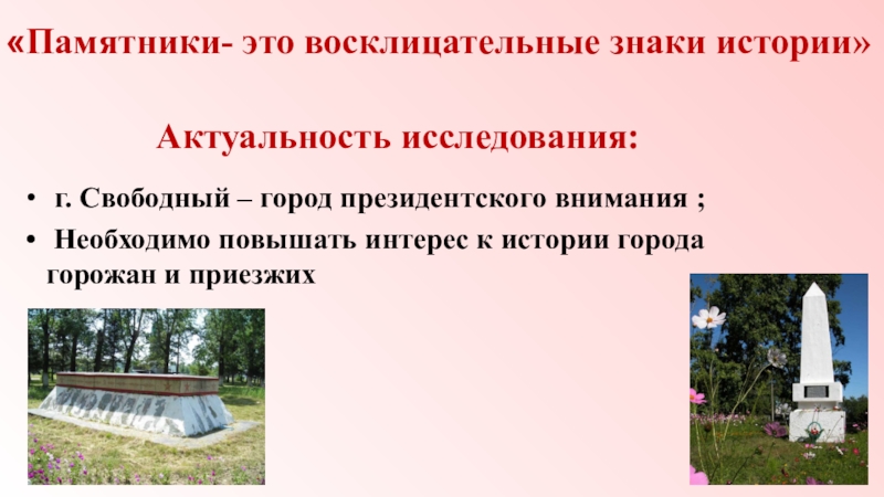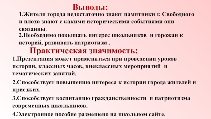 1.Жители города недостаточно знают памятники г. Свободного и плохо знают с какими историческими событиями они связанны.