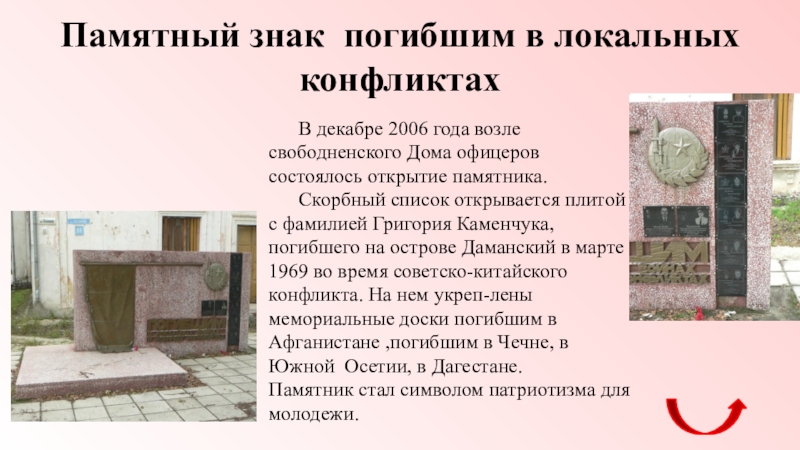 Слайд 28Памятный знак погибшим в локальных конфликтах