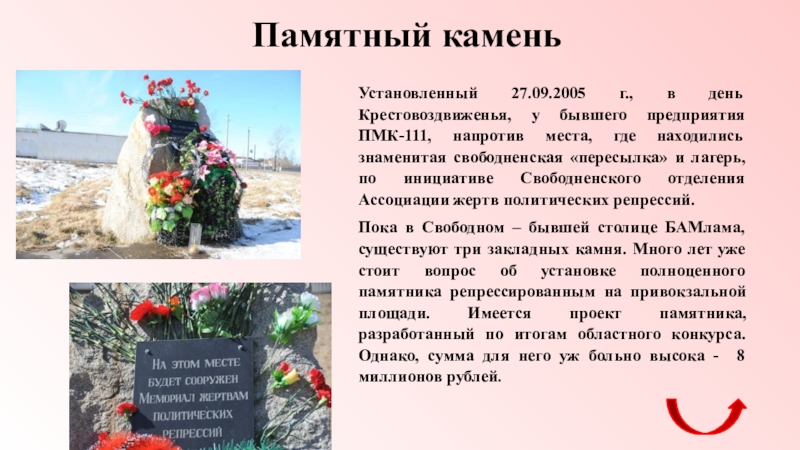 Пока в Свободном – бывшей столице БАМлама, существуют три закладных камня. Много лет уже стоит вопрос об установке полноценного памятника репрессированным на привокзальной площади. Имеется проект памятника, разработанный по итогам областного конкурса. Однако, сумма для него уж больно высока - 8 миллионов рублей.