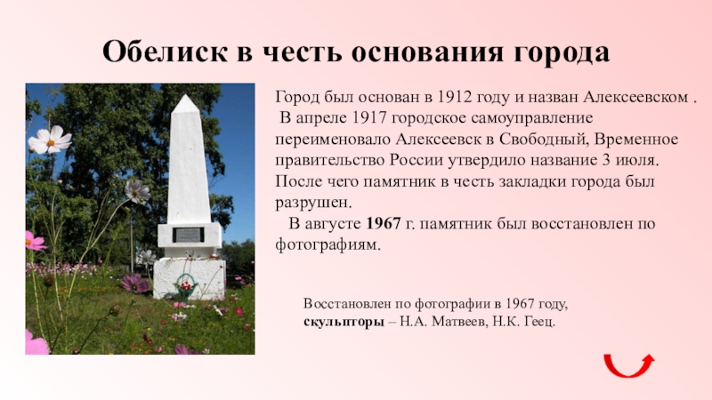 скульпторы – Н.А. Матвеев, Н.К. Геец.