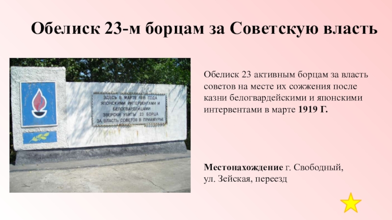 Слайд 19Обелиск 23-м борцам за Советскую власть