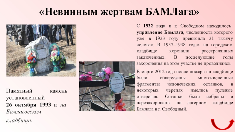 С 1932 года в г. Свободном находилось управление Бамлага, численность которого уже в 1933 году превысила 31 тысячу человек. В 1937–1938 годах на городском кладбище хоронили расстрелянных заключенных. В последующие годы захоронения на этом участке не проводились.