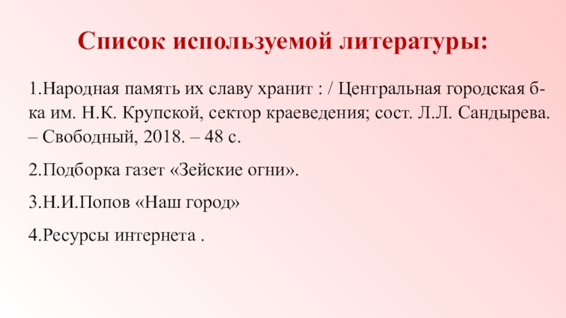б-ка им. Н.К. Крупской, сектор краеведения; сост. Л.Л. Сандырева. – Свободный, 2018. – 48 с.