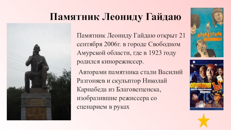 Памятник Леониду Гайдаю открыт 21 сентября 2006г. в городе