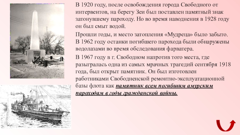 Слайд 22В 1920 году, после освобождения города Свободного от интервентов, на берегу
