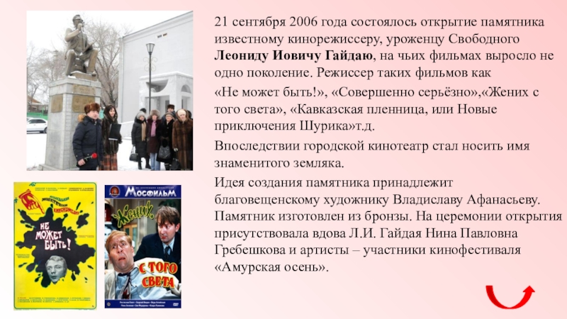 Слайд 1521 сентября 2006 года состоялось открытие памятника известному кинорежиссеру, уроженцу Свободного