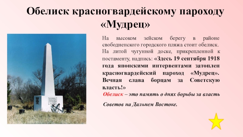 стоит обелиск. На литой чугунной доске, прикрепленной к постаменту, надпись: «Здесь 19 сентября 1918 года японскими интервентами затоплен красногвардейский пароход «Мудрец». Вечная слава борцам за Советскую власть!»