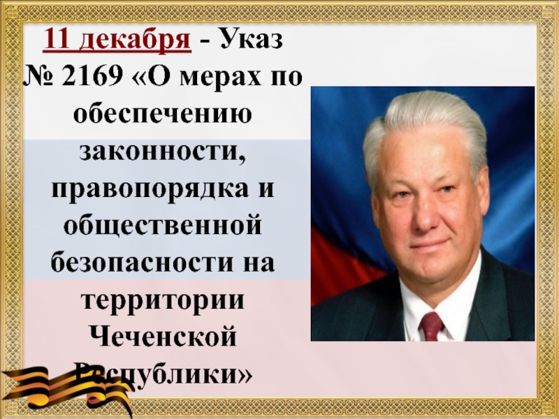 11 декабря - Указ № 2169 «О мерах по обеспечению законности, правопорядка и общественной безопасности на территории Чеченской Республики»