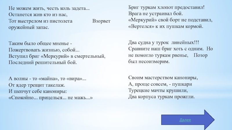 Бриг туркам хлопот предоставил! Врага не устраивал бой. «Меркурий» свой борт не подставил, «Вертелся» к их пушкам кормой.