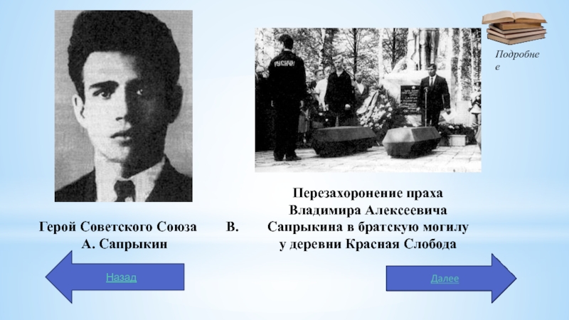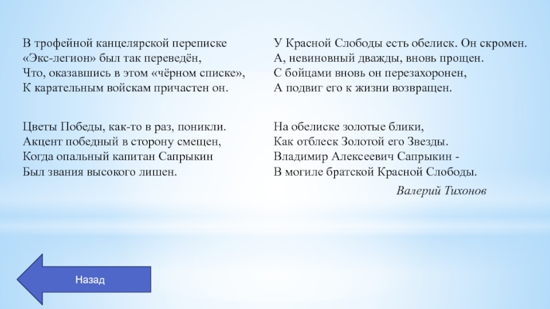 На обелиске золотые блики, Как отблеск Золотой его Звезды. Владимир Алексеевич Сапрыкин - В могиле братской Красной Слободы.