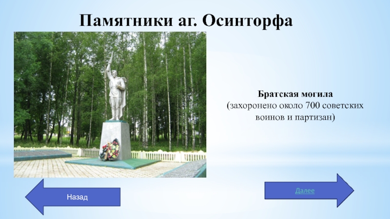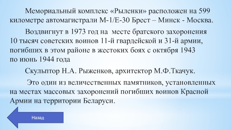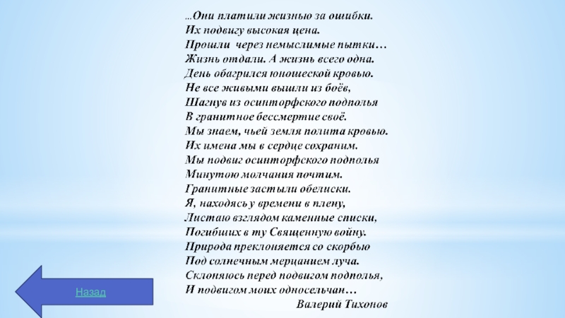 Слова те, что в бронзу отлиты, Звучат здесь на русский манер: Никто и ничто не забыто. Ваш подвиг – «Потомству в пример».