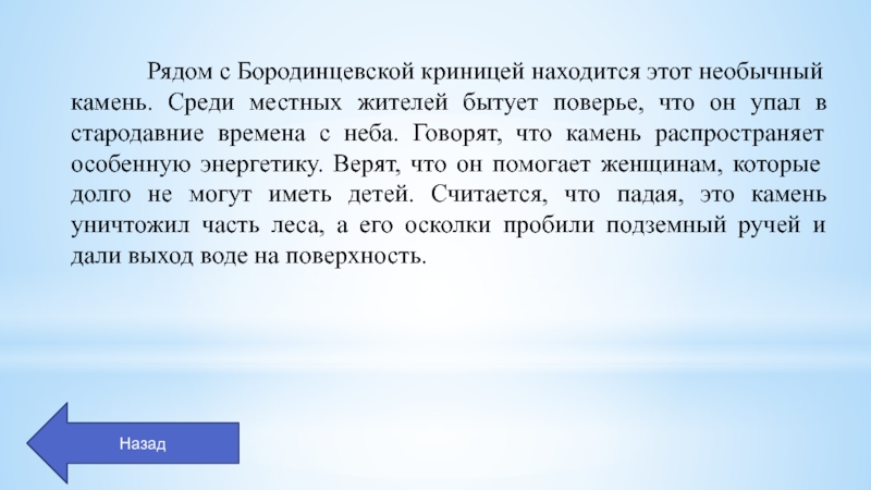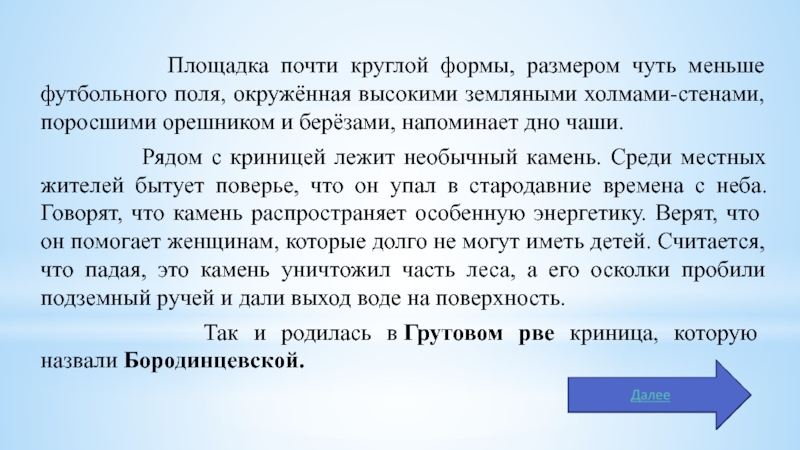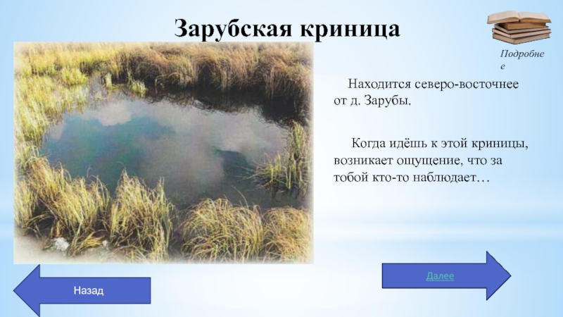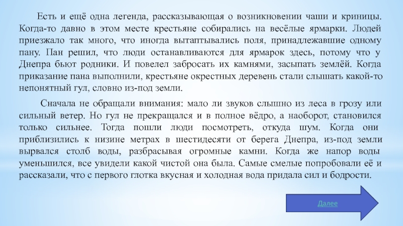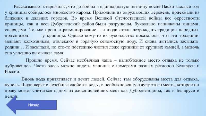 Студеная ключевая вода в источнике не только исключительно чистая, но и целебная, богатая железом и серой. Криница известна с давних времен. Множество легенд и преданий о ее возникновении притягивают сюда людей, а красивая природа и мягкое журчание воды навевают спокойствие и умиротворение