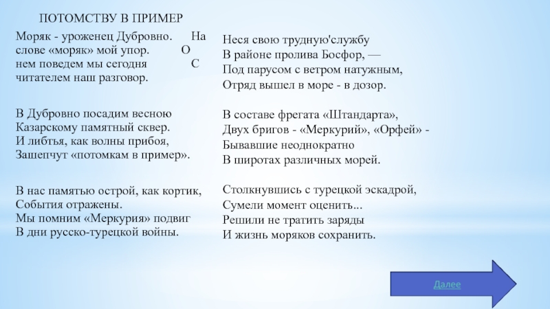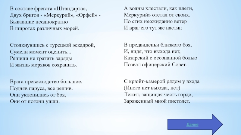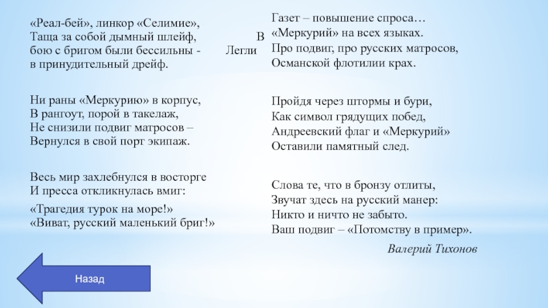 Пройдя через штормы и бури, Как символ грядущих побед, Андреевский флаг и «Меркурий» Оставили памятный след.