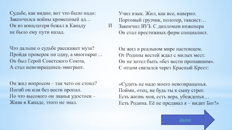 «Судить не надо моего невозвращенья. Пойми, отец, не будь ты к сыну строг. Есть жизнь моя, есть вера, убежденья… Есть Родина. Её не предавал я – видит Бог!»
