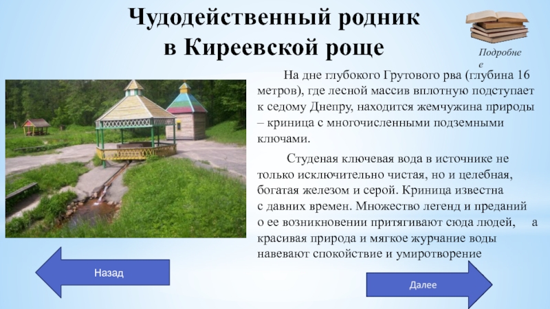 На дне глубокого Грутового рва (глубина 16 метров), где лесной массив вплотную подступает к седому Днепру, находится жемчужина природы – криница с многочисленными подземными ключами.