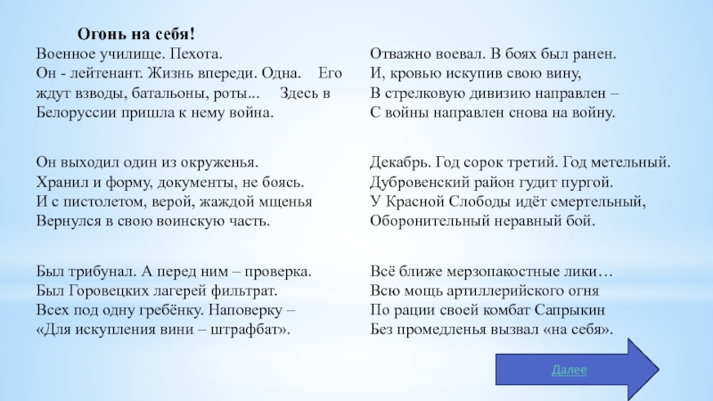 Отважно воевал. В боях был ранен. И, кровью искупив свою вину, В стрелковую дивизию направлен – С войны направлен снова на войну.
