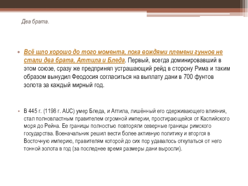 не стали два брата, Аттила и Бледа. Первый, всегда доминировавший в этом союзе, сразу же предпринял устрашающий рейд в сторону Рима и таким образом вынудил Феодосия согласиться на выплату дани в 700 фунтов золота за каждый мирный год.
