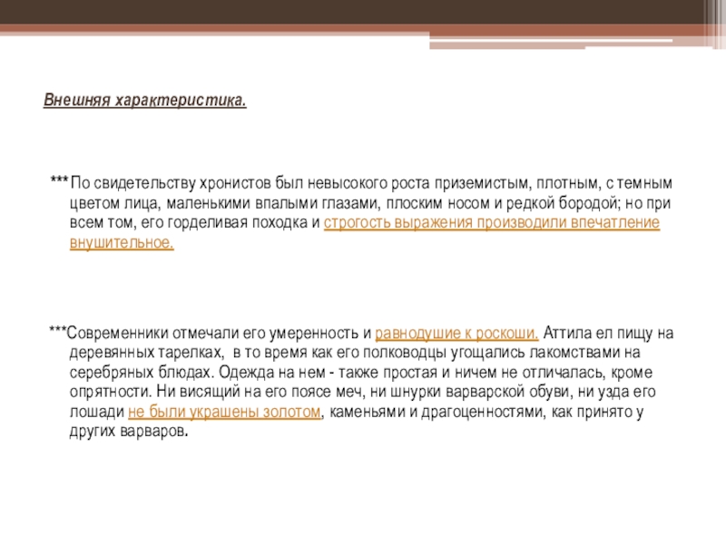 ***Современники отмечали его умеренность и равнодушие к роскоши. Аттила ел пищу на деревянных тарелках, в то время как его полководцы угощались лакомствами на серебряных блюдах. Одежда на нем - также простая и ничем не отличалась, кроме опрятности. Ни висящий на его поясе меч, ни шнурки варварской обуви, ни узда его лошади не были украшены золотом, каменьями и драгоценностями, как принято у других варваров.
