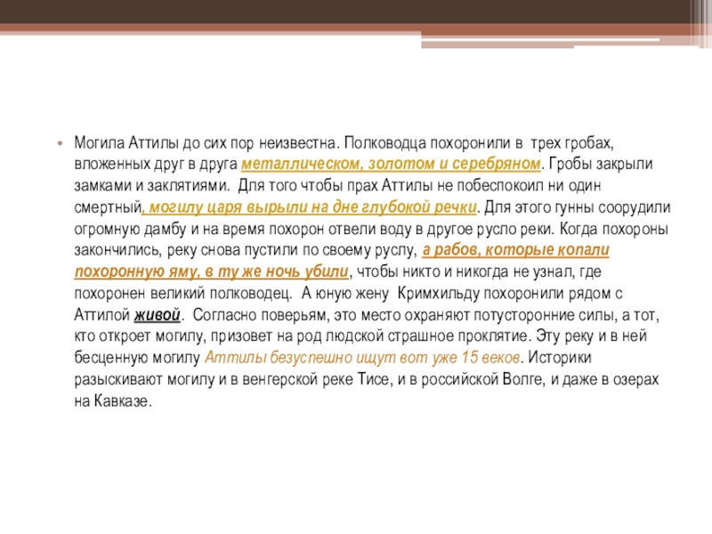 Слайд 10Могила Аттилы до сих пор неизвестна. Полководца похоронили в трех гробах,