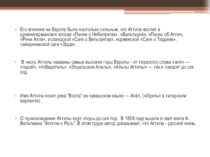 Слайд 8Его влияние на Европу было настолько сильным, что Аттила воспет в