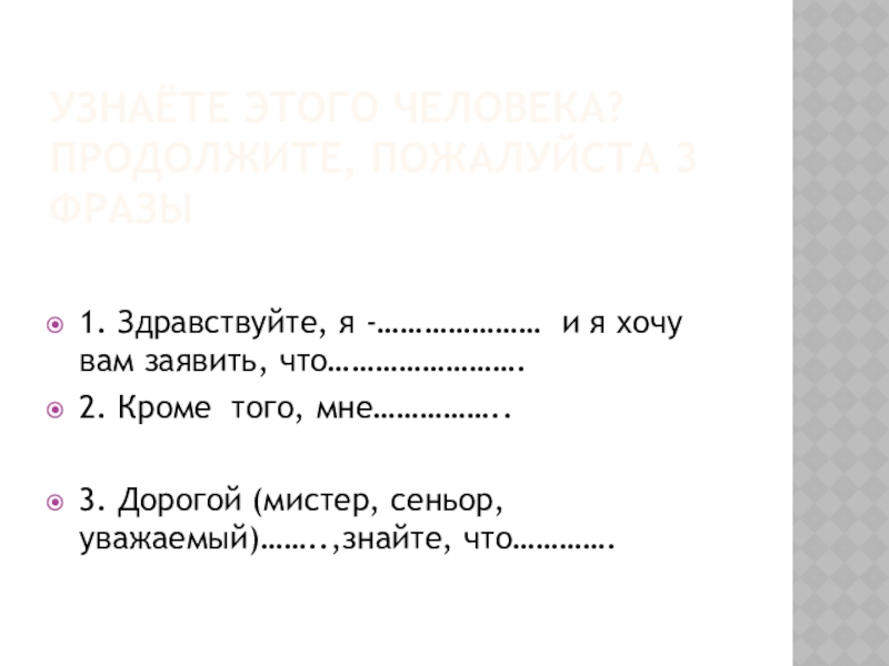 Узнаёте этого человека? Продолжите, пожалуйста 3 фразы1. Здравствуйте, я -………………… и я хочу вам заявить, что…………………….2. Кроме того, мне……………..3. Дорогой (мистер, сеньор, уважаемый)……..,знайте, что………….