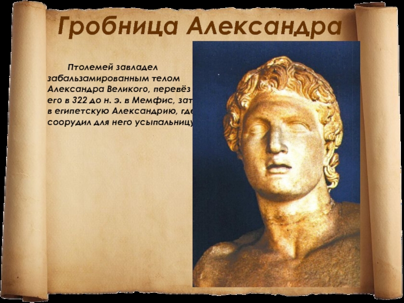до н. э. в Мемфис, затем в египетскую Александрию, где соорудил для него усыпальницу.