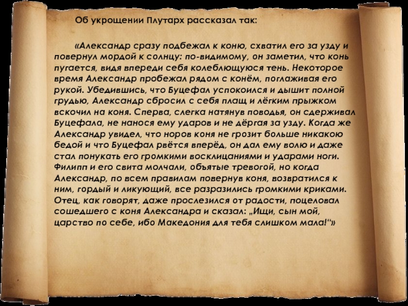 за узду и повернул мордой к солнцу: по-видимому, он заметил, что конь пугается, видя впереди себя колеблющуюся тень. Некоторое время Александр пробежал рядом с конём, поглаживая его рукой. Убедившись, что Буцефал успокоился и дышит полной грудью, Александр сбросил с себя плащ и лёгким прыжком вскочил на коня. Сперва, слегка натянув поводья, он сдерживал Буцефала, не нанося ему ударов и не дёргая за узду. Когда же Александр увидел, что норов коня не грозит больше никакою бедой и что Буцефал рвётся вперёд, он дал ему волю и даже стал понукать его громкими восклицаниями и ударами ноги. Филипп и его свита молчали, объятые тревогой, но когда Александр, по всем правилам повернув коня, возвратился к ним, гордый и ликующий, все разразились громкими криками. Отец, как говорят, даже прослезился от радости, поцеловал сошедшего с коня Александра и сказал: „Ищи, сын мой, царство по себе, ибо Македония для тебя слишком мала!“»