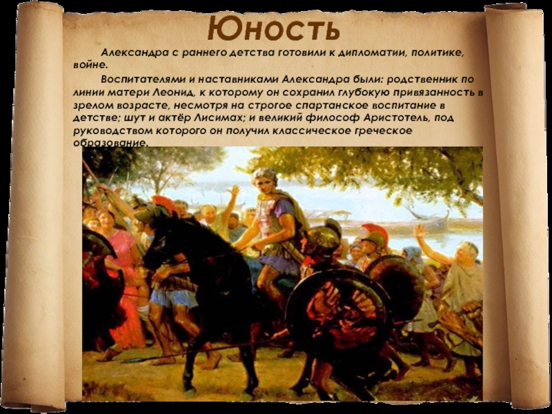 наставниками Александра были: родственник по линии матери Леонид, к которому он сохранил глубокую привязанность в зрелом возрасте, несмотря на строгое спартанское воспитание в детстве; шут и актёр Лисимах; и великий философ Аристотель, под руководством которого он получил классическое греческое образование.