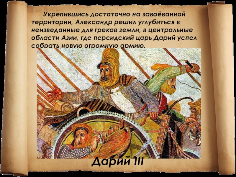 Слайд 26Укрепившись достаточно на завоёванной территории, Александр решил углубиться в неизведанные для