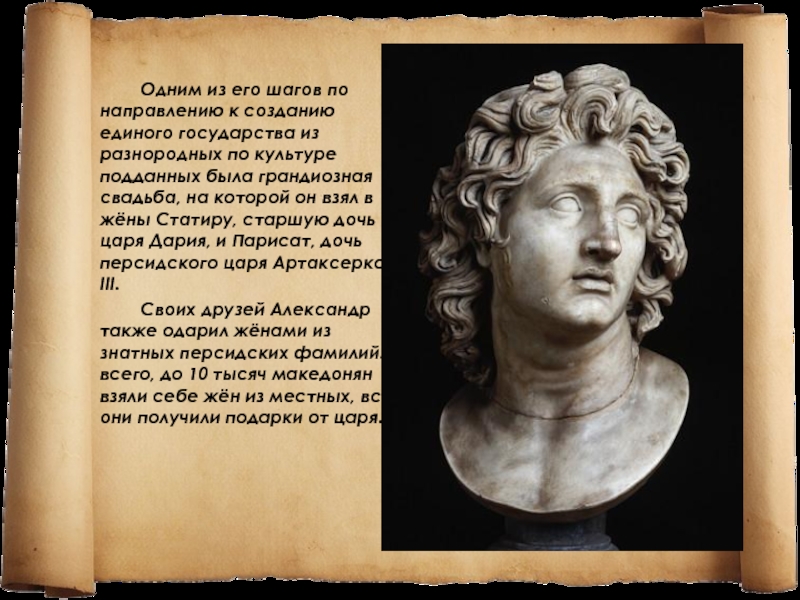 разнородных по культуре подданных была грандиозная свадьба, на которой он взял в жёны Статиру, старшую дочь царя Дария, и Парисат, дочь персидского царя Артаксеркса III.