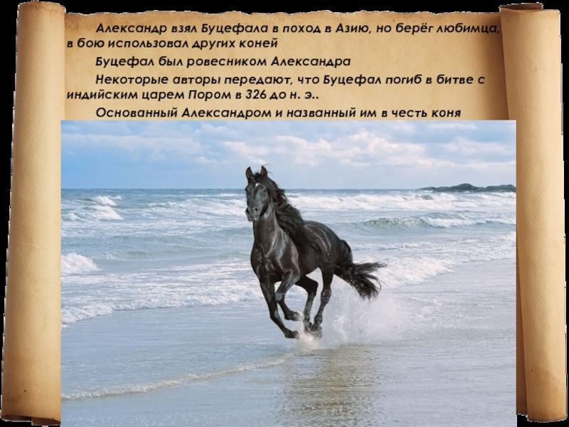 Слайд 16Александр взял Буцефала в поход в Азию, но берёг любимца, в