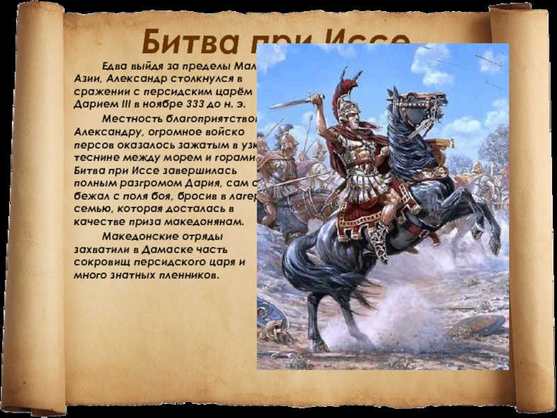 Македонские отряды захватили в Дамаске часть сокровищ персидского царя и много знатных пленников.
