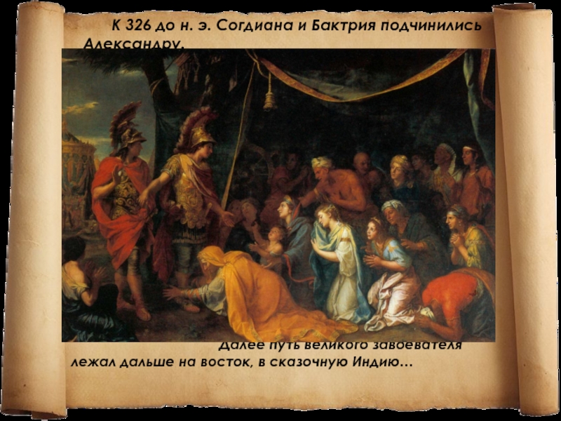 Слайд 32К 326 до н. э. Согдиана и Бактрия подчинились Александру.