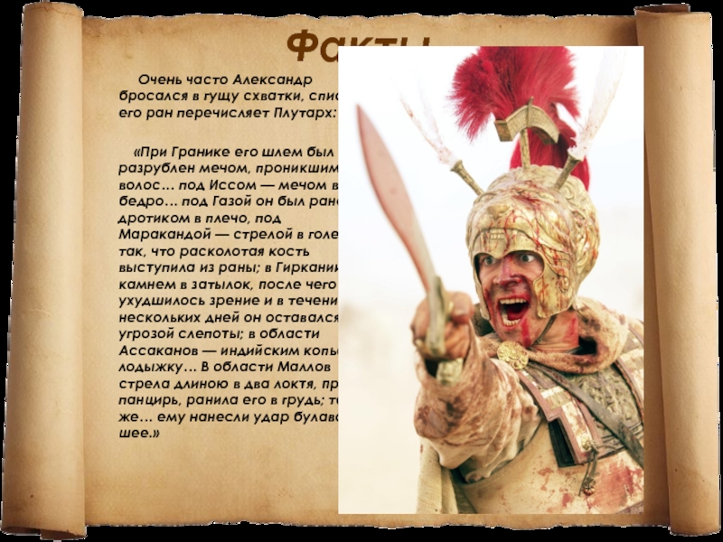 «При Гранике его шлем был разрублен мечом, проникшим до волос… под Иссом — мечом в бедро… под Газой он был ранен дротиком в плечо, под Маракандой — стрелой в голень так, что расколотая кость выступила из раны; в Гиркании — камнем в затылок, после чего ухудшилось зрение и в течение нескольких дней он оставался под угрозой слепоты; в области Ассаканов — индийским копьём в лодыжку… В области Маллов стрела длиною в два локтя, пробив панцирь, ранила его в грудь; там же… ему нанесли удар булавой по шее.»