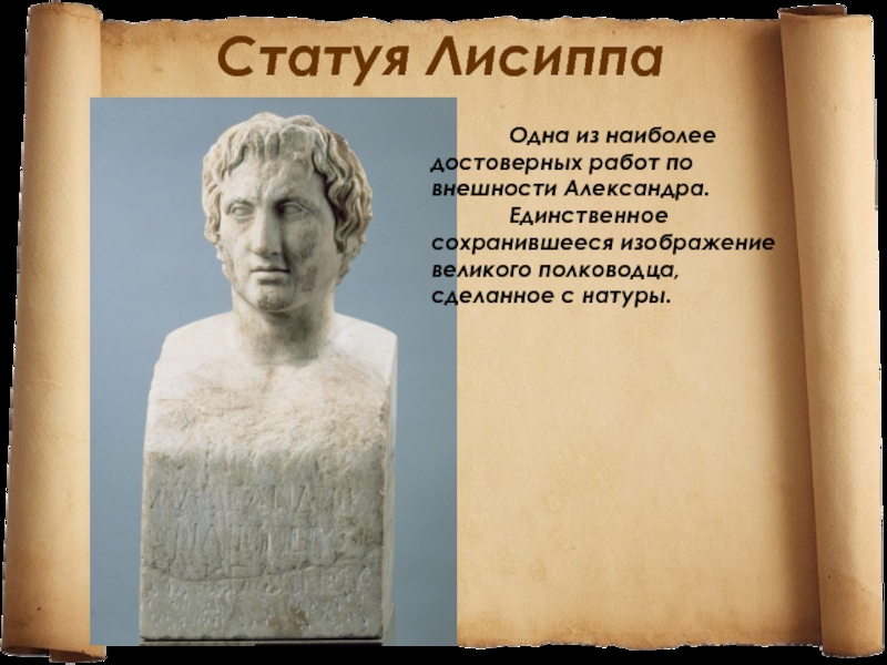 статуи Лисиппа, и сам он считал, что только этот скульптор достоин взять его изображения. Этот мастер сумел точно воспроизвести то, чему впоследствии подражали многие из преемников и друзей царя, — лёгкий наклон шеи влево и томность взгляда.