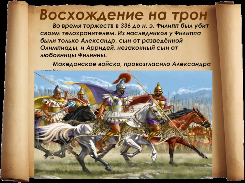 был убит своим телохранителем. Из наследников у Филиппа были только Александр, сын от разведённой Олимпиады, и Арридей, незаконный сын от любовницы Филинны.