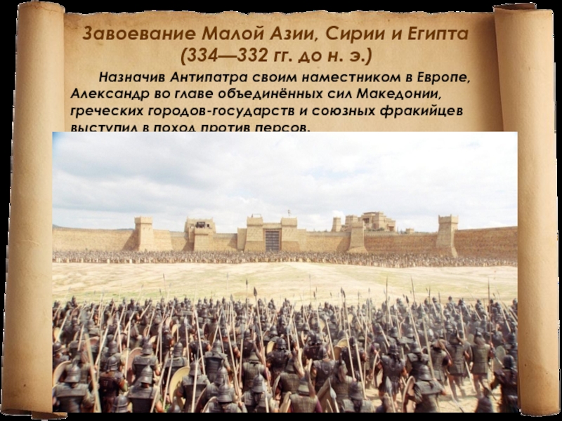Антипатра своим наместником в Европе, Александр во главе объединённых сил Македонии, греческих городов-государств и союзных фракийцев выступил в поход против персов.