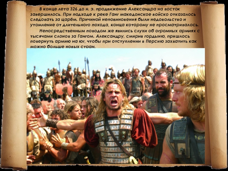 Непосредственным поводом же явились слухи об огромных армиях с тысячами слонов за Гангом. Александру, смирив гордыню, пришлось повернуть армию на юг, чтобы при отступлении в Персию захватить как можно больше новых стран.