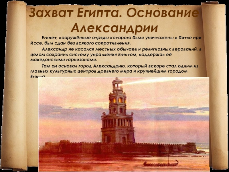 Там он основал город Александрию, который вскоре стал одним из главных культурных центров древнего мира и крупнейшим городом Египта.