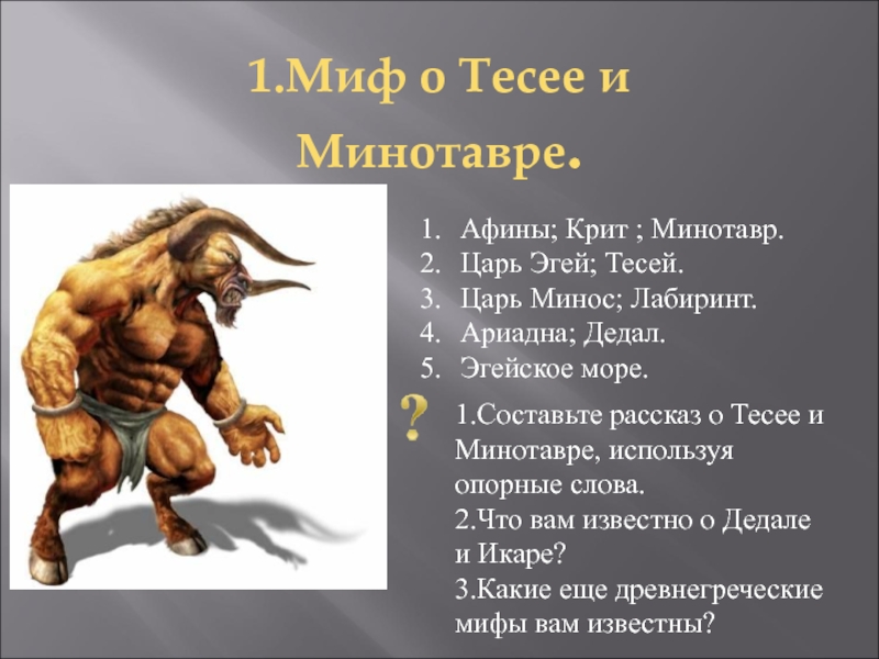 1.Составьте рассказ о Тесее и Минотавре, используя опорные слова.