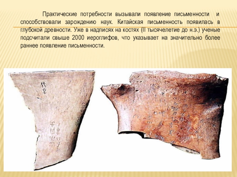 наук. Китайская письменность появилась в глубокой древности. Уже в надписях на костях (ΙΙ тысячелетие до н.э.) ученые подсчитали свыше 2000 иероглифов, что указывает на значительно более раннее появление письменности.
