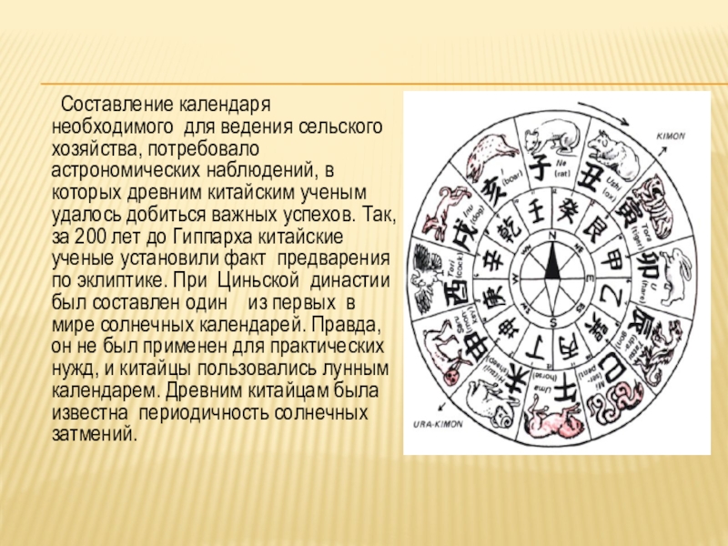 которых древним китайским ученым удалось добиться важных успехов. Так, за 200 лет до Гиппарха китайские ученые установили факт предварения по эклиптике. При Циньской династии был составлен один из первых в мире солнечных календарей. Правда, он не был применен для практических нужд, и китайцы пользовались лунным календарем. Древним китайцам была известна периодичность солнечных затмений.