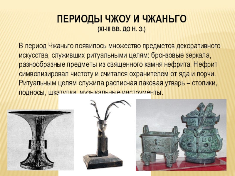 период Чжаньго появилось множество предметов декоративного искусства, служивших ритуальными целям: бронзовые зеркала, разнообразные предметы из священного камня нефрита. Нефрит символизировал чистоту и считался охранителем от яда и порчи. Ритуальным целям служила расписная лаковая утварь – столики, подносы, шкатулки, музыкальные инструменты.
