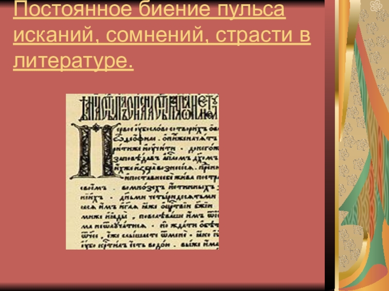 Слайд 8Постоянное биение пульса исканий, сомнений, страсти в литературе.