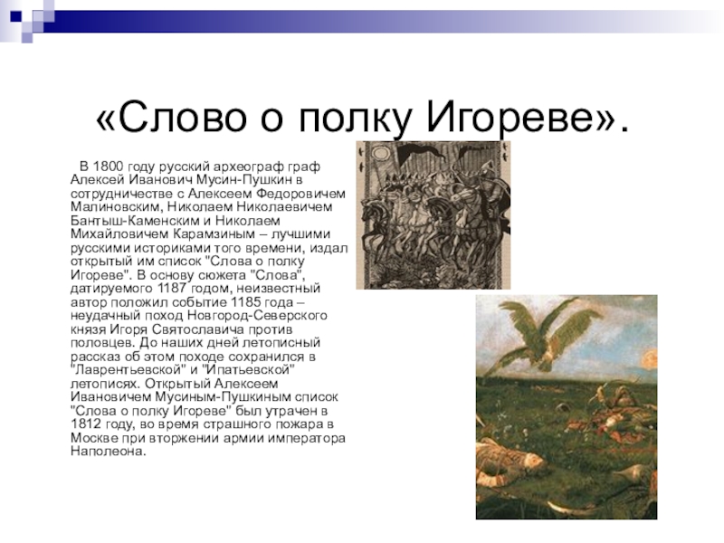 Мусин-Пушкин в сотрудничестве с Алексеем Федоровичем Малиновским, Николаем Николаевичем Бантыш-Каменским и Николаем Михайловичем Карамзиным – лучшими русскими историками того времени, издал открытый им список "Слова о полку Игореве". В основу сюжета "Слова", датируемого 1187 годом, неизвестный автор положил событие 1185 года – неудачный поход Новгород-Северского князя Игоря Святославича против половцев. До наших дней летописный рассказ об этом походе сохранился в "Лаврентьевской" и "Ипатьевской" летописях. Открытый Алексеем Ивановичем Мусиным-Пушкиным список "Слова о полку Игореве" был утрачен в 1812 году, во время страшного пожара в Москве при вторжении армии императора Наполеона.